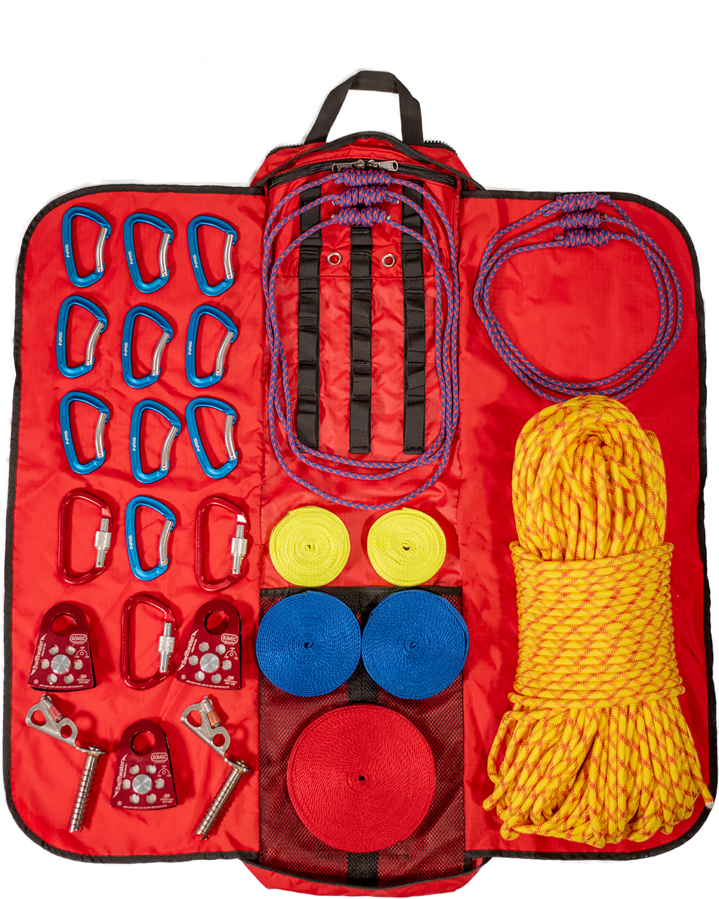 400 英尺/122 m 的 8 毫米绳索或 250 英尺/76 m 的 10 毫米绳索。第二个包是装备包,带有环,最多可容纳 18 个登山扣。滑轮可以连接到登山扣上。一个网状口袋,用于存放普鲁西克和织带环。装备袋缝有翻盖,使其成为装备的底布。该包将您的绳索和设备放入一个易于携带和存放的包中。